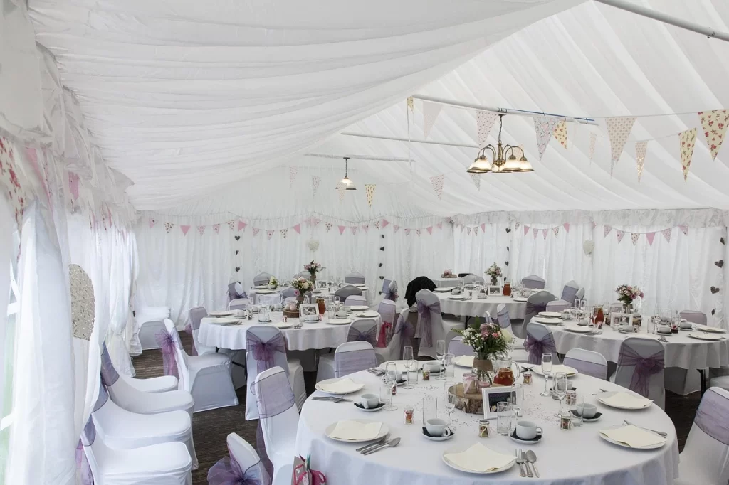 - 6m x 12m: Best for larger weddings or community events. Accommodates 60 seated or 80 standing.